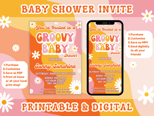 Groovy Baby Shower Party Bundle | Groovy Baby Invitation, Welcome Sign, Thank You Card, Table Signs, Games | Digital
