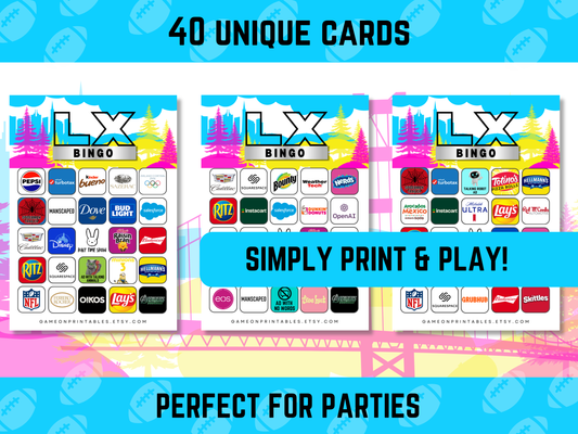 The Big Game Commercials Bingo 2026 | Football Party Games | LX Watch Party | 40 Cards | Printable