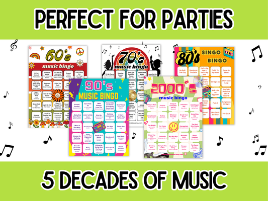 5-Pack Music Bingo With Playlist | 60s, 70s, 80s, 90s, 2000s Bingo | Printable Games