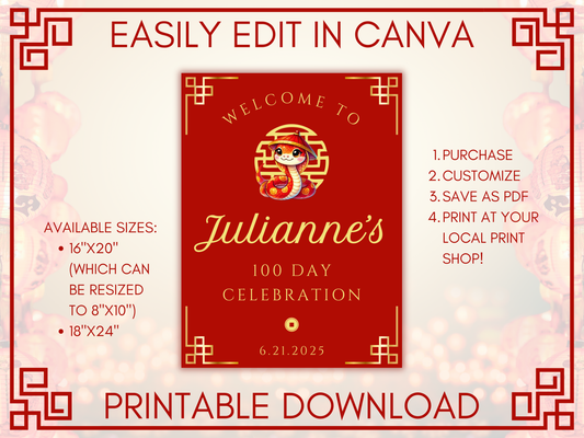 100 Day Celebration, Year of the Snake Welcome Sign | Red Egg and Ginger Party | Editable