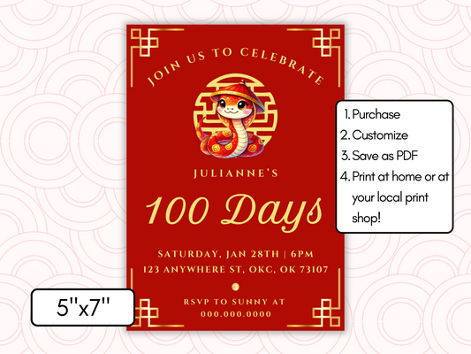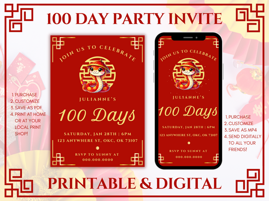 100 Day Celebration, Year of the Snake Invitation | Red Egg and Ginger Party Printable, Digital Invite | Editable