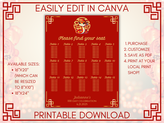 100 Day Celebration, Year of the Snake Seating Chart | Red Egg and Ginger Party | Editable